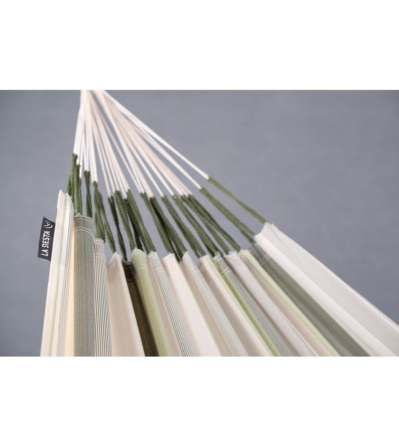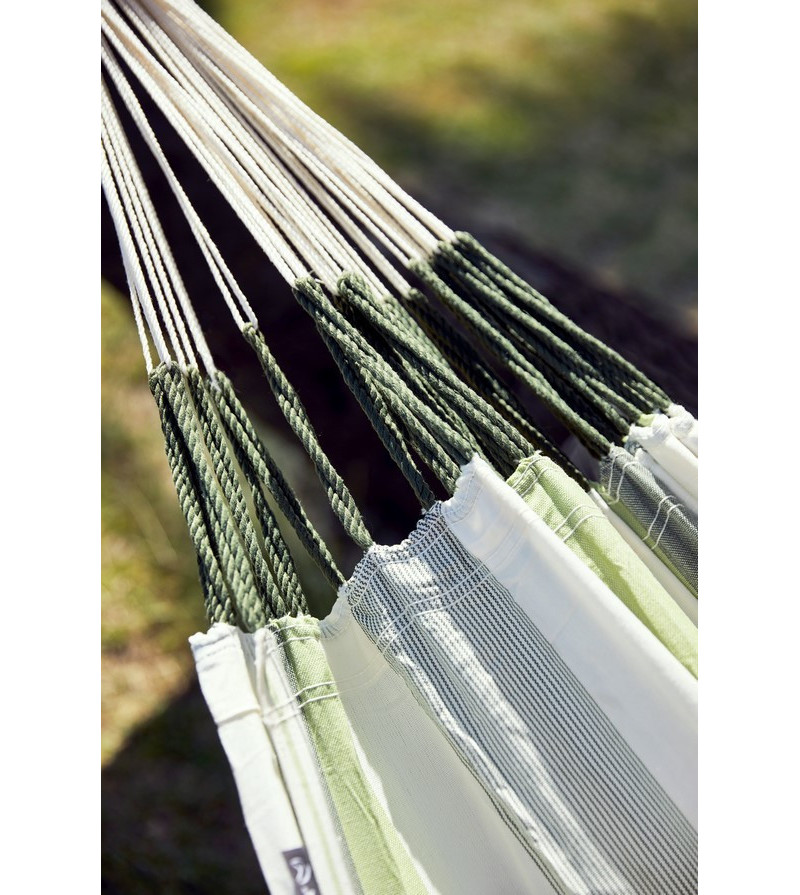 Velká venkovní houpací síť Brisa ve verzi King-Size. Ručně vyrobená v Kolumbii ze speciálních vláken HamacTex, která jsou vysoce odolná a odolná vůči vnějším vlivům, je ideální pro relaxaci venku, na zahradě nebo na výletech. Vyznačuje se zvýšeným počtem upevňovacích šňůr a zesílenými okraji, které dále zvyšují její odolnost a bezpečnost. Pruhovaný vzor je k dispozici ve dvou barvách: cedrově zelená a mořská sůl modrá, v kombinaci s ecru a šedými pruhy. Brisa zaručuje nosnost až 200 kilogramů a v kombinaci s velkou lehací plochou tato houpací síť pojme celou rodinu. Bude vypadat úžasně zavěšená na dřevěném stojanu nebo mezi stromy pomocí speciální montážní sady.